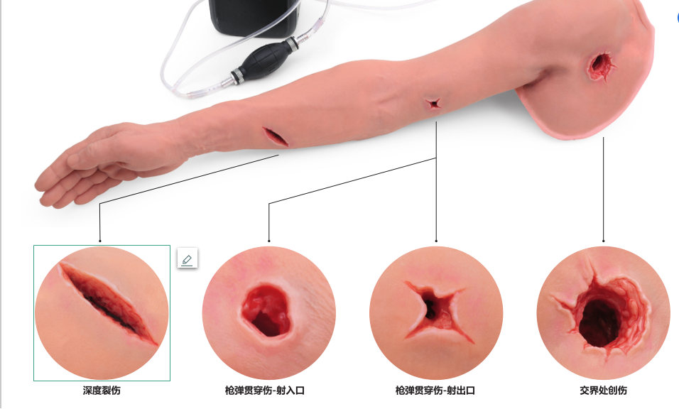 肩模型真实地还原伤口和出血。通过伤口填塞和应用止血带来控制出血,开展与创伤有关的指导性和动手性培训,改善院前急救护理培训。此外,该模型特别适合用于战术战斗伤亡护理(TCCC)以及平民伤亡护理(TECC)培训。