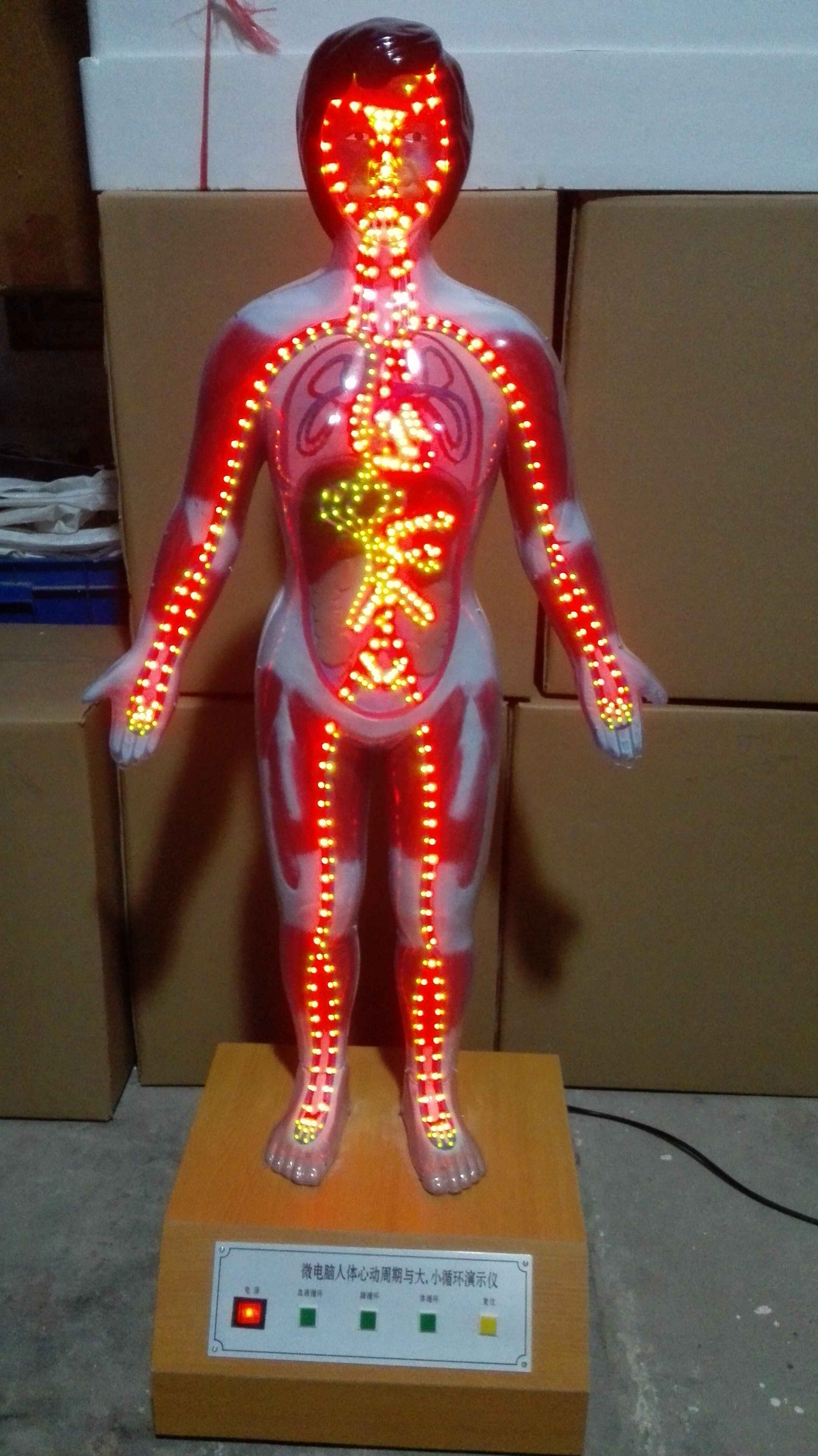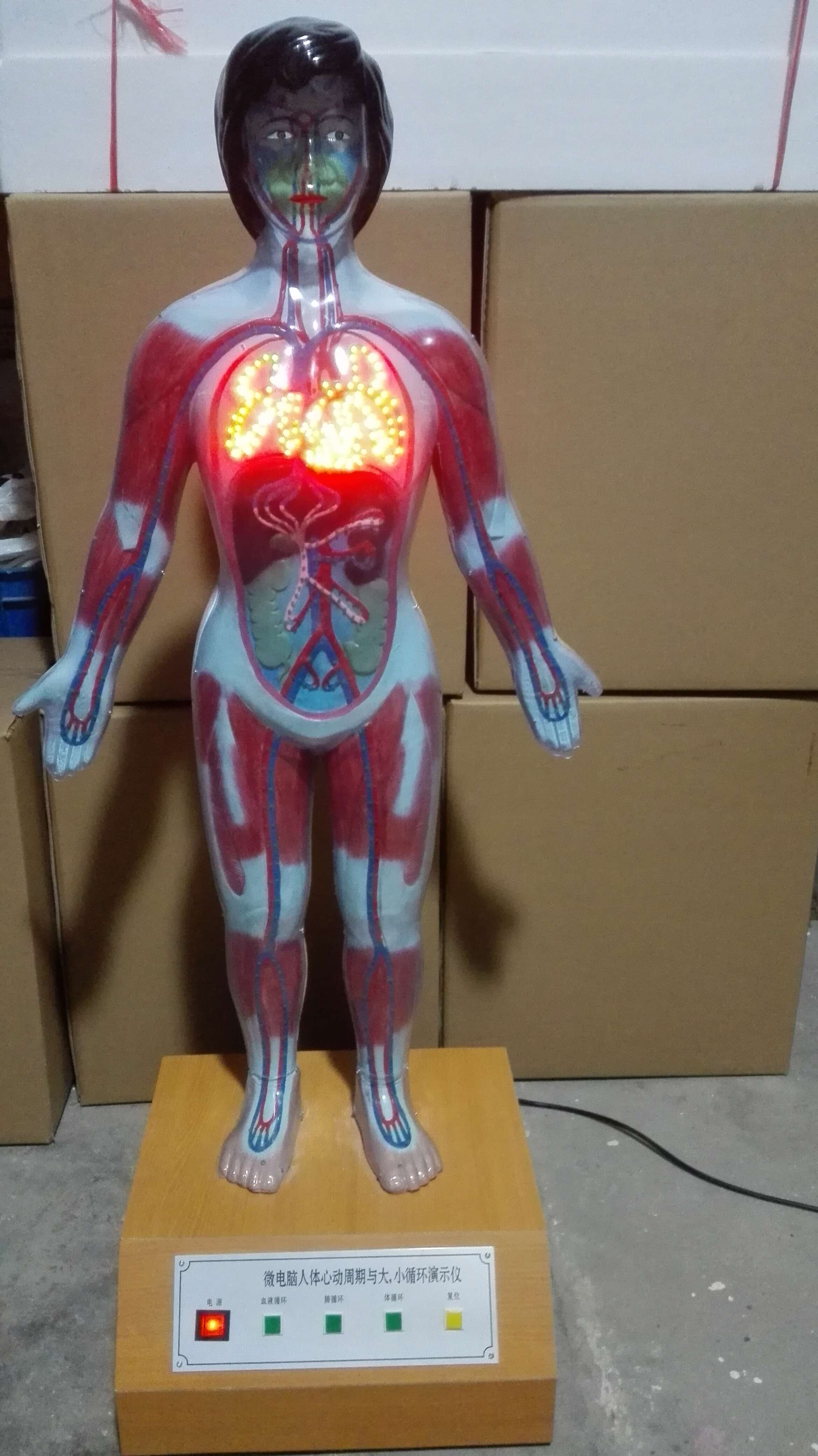 JD/D021微电脑人体心动周期与大、小循环演示仪为成人女性,材质后部采用增强塑料,前部为PVC塑料,动静脉采用红、蓝发光二极管,底座后方有220V电源插座,前上方有全身血液循环、体循环、肺循环、复位四个演示按钮。