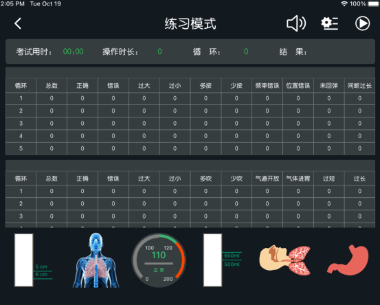 *操作统计:吹气正确率、吹气错误次数、吹气时间、吹气错误分析(过大、过小、多吹、少吹)、按压正确率、按压错误次数、按压错误分析(过大、过小、多按、少按、位置错误、按压未完全回弹)、按压频率错误、按压间隔过大的次数、CPR循环数、循环中断时间。