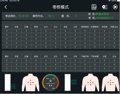 13.3考核模式:考官可根据竞赛要求自定义设置参数,具有国赛标准一键设置功能,在设定的考核时间内,按照30:2的比例进行考核,设置项包括:竞赛时间、CPR循环次数(用于选择单人或多人操作)、按压和吹气的正确比率(决定急救操作后的复活标准)、潮气量和按压深度的标准范围。