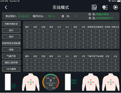 13.4实战模式:符合AHA操作流程:判断环境安全,拍打、呼叫,判断呼吸及颈动脉,呼救,气道开放,清除口腔异物,AED使用等操作。按照最新标准30:2 的比例进行胸外按压及人工呼吸,按压和人工呼吸。多项实战考核指标包含:气道开放、按压位置、按压深度、按压回弹、按压中断,吹气量、吹气时间等。