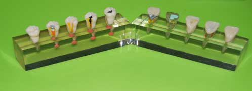 该模型由健康牙,龉齿,做好充填准备的牙齿,已填充的牙齿以及用合金充填修补的牙齿等5个部件组成,并显示龉齿与牙髓炎等病理过程以及临床治疗方法。共5个部位指示标志。