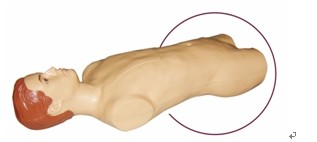 仿真标准化病人取平卧位,肩枕过伸,头低并转向左侧,质地柔软,触感真实,外观形象逼真; 解剖位置准确:锁骨、锁骨胸骨端、胸锁乳突肌、胸骨上窝、脐、腹股沟、腹股沟韧带等体表标志可明显感知; 电子模拟颈动脉搏动、股动脉搏动; 可行颈内静脉穿刺训练、锁骨下静脉穿刺训练、颈外静脉穿刺训练、股静脉穿刺训练,穿刺有落空感,可抽出模拟静脉血; 可行心脏漂浮导管术训练。