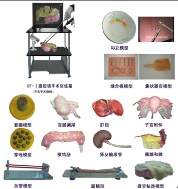 因此国内外已研制出腹腔镜手术训练箱,我公司研制的腹腔镜手术训练箱,设有操作台,手术器材可设置在显示器侧面或正面任选、彩色液晶显示器、高清摄像头图像清晰、模型放置台方便固定,具有结构简单、性能可靠、使用方便、经济实惠、容易普及的特点。手术训练箱用各种模型包括:彩豆模型、套圈模型、穿线模型、缝合板模型、囊状器官模型、盲肠阑尾、肝脏胆囊、子宫及附件、横结肠、肾及输尿管、胰腺和脾脏、血管模型、肠模型、器官粘连模型及各种手术模型等,并可根据用户需要进行个性化设计。