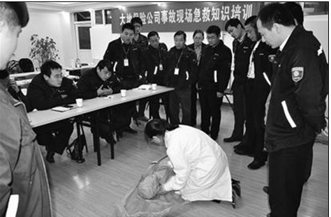该培训主要包括现场紧急止血、伤重人员搬运方法及注意事项、心肺复苏、轻微创伤现场处理等。同时,大地保险公司给每一辆查勘车均配备了创伤急救包,使每辆查勘车都成为交通事故创伤应急救助站。近年来,响应青岛保险业“和谐保险”建设的要求,中国大地保险公司积极创新,从细节出发,为现场客户准备了雨伞、矿泉水、电瓶接线等,以优质的服务回馈社会,主动发挥保险行业的社会保障职能,致力打造成为对客户尽责,对社会负责的良好社会形象