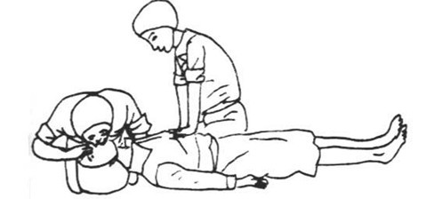 ①将患者俯卧,腰部垫高,头部下垂,并以手压其背部。