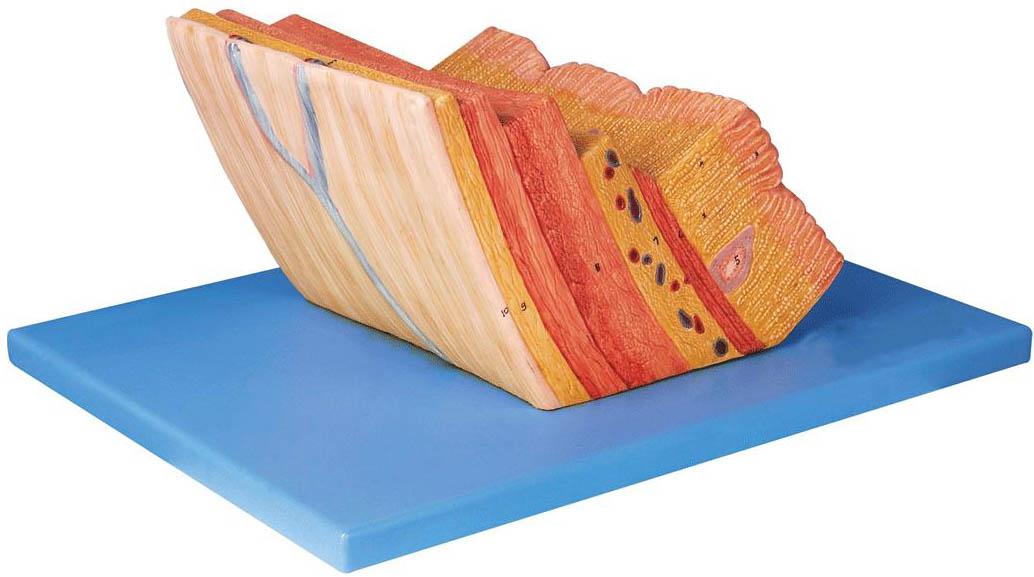 ■ 该模型显示胃体部胃壁的层次,包括粘膜层胃小凹、粘膜上皮、胃底腺壁细胞、粘膜肌层、粘膜下层、肌层和浆膜等结构,共有10个部位指示标志。