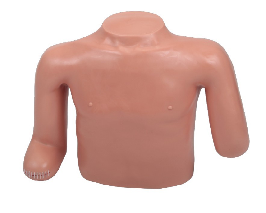 ■ 右臂肩关节、肘关节、腕关节可活动,肘关节可伸展,腕关节可旋转,既可摆成上肢骨折固定位,也可摆成上肢的功能位置,右手食指截指,可练习截指的包扎;左臂为肘上截肢,可进行残肢的包扎;