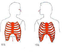 呼氣時=肋骨下降,橫膈上升,胸腔縮小,胸腔壓力變大, 氣體由內部呼出。