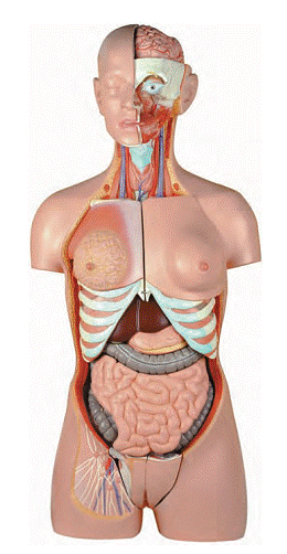 此模型为85公分自然大人体两性躯干,共24部件。男女生殖器可互换,详细的再现了内脏器官细节构造,显示了各系统:呼吸系统,消化系统,泌尿系统,以及心脏和人体各大动脉。并且在每一个器官或结构部位都标示了数字,结合说明书有利于精确地认识人体解剖学的器官结构适于教学研究的目的;部件如下:大脑(1),小脑(1),左右肺带肋骨(2),肝(1),胃(2),心脏(2),胰十二指肠大小肠带盲肠(4),右肾盖(1),男性生殖器(4),女性生殖器(4),眼球(1),躯壳(1)