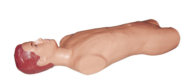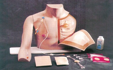 ▲高度模拟的上半身模型,带有可分开的右手手臂,可进行插入、护理和取出,长时间的血管通道等模拟训练。
