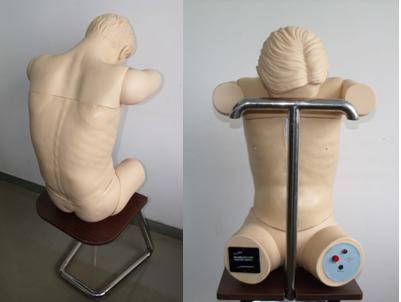模拟人腰部可活动,模拟人必须取正确体位后(取弓形侧卧位),方可进行腰椎穿刺训练。可进行各穿刺点的准确触摸定位,穿刺时应有阻抗感。可以练习脊、硬膜外、尾骨、骶骨和腰椎的注射技术。