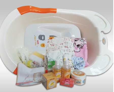 婴儿护理工具箱包括:浴盆、3块纸尿布、湿巾、婴儿睡衣、小汗衫、奶瓶、鞋子、毛巾 婴儿粉 沐浴露