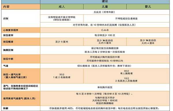 在2010国际心肺复苏指南中,基础生命支持(BLS)得到进一步的重视,特别强调了有效不间断胸外按压的意义。该标准对按压通气比值、按压通气循环周期、按压通气参数等CPR核心技术都作了重大修订,并提倡ADE的普及使用。(具体修改内容见台下2010年最新国际心肺复苏标准比例表)。