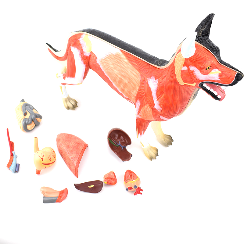 该模型采用等比设计,选取成年狼性犬为蓝本,采用正中矢状切为解剖结构,可以分解成11部份,右侧设计展示了狗的肌肉解剖结构,为了解其运动构造,提供了详细的参考,在器官结构方面。气管食道主动脉,肺,心脏(可分2部分),胃,肝,脾脏,肠,膀胱器官可以拆下,单独进行演示,更有利于学习教学使用,该模型详细的展现了狗的生理和组织结构,如消化系统,呼吸系统,生殖系统等等,是畜牧动物教学演示不可多得的一款教具,也是宠物诊所值的推荐一款展示模型