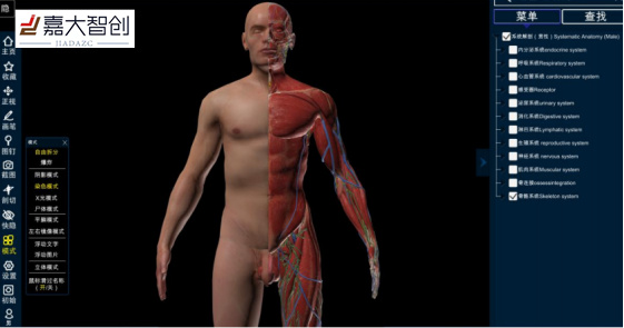 系统解剖3D虚拟教学系统,采用实时三维图形生成技术展现三维人体形态结构,可进行任意的选择、缩放、旋转组合等操作,系统完整。可用于演示人体形态结构,也可用于人体解剖学教学。
