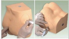 该模型设计简单明了,半边臀部区域内有注射部位分虚线标志、注射模块组成。注射模块可以注射液体、方便取出、捏干液体,是学员实习的理想产品。