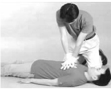 ②救护员双手掌根同向重叠,十指相扣,掌心翘起,手指离开胸壁,双臂伸直 ,上半身前倾,以髋关节为支点,垂直向下、用力、有节奏地按压30次。
