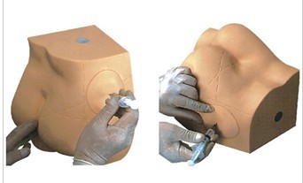 该模型设计简单明了,半边臀部区域内有注射部件区分虚线标志、注射模块组成。注射模块可以注射液体、方便取出、捏液体,是学员实习的理想产品。