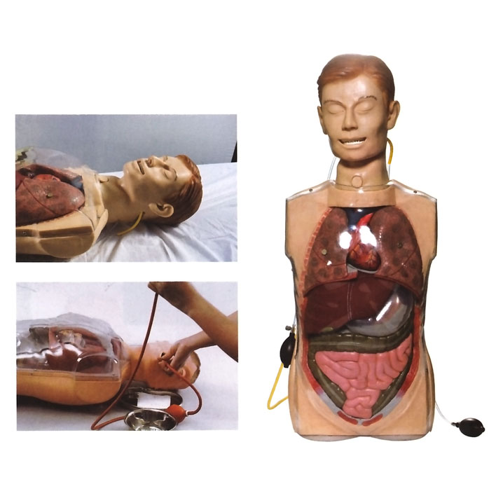 该产品模拟一成人男性上半身结构,解剖结构精细,口腔内有牙、舌、悬雍垂,呼吸道内部的声门、会厌、喉、杓状软骨、声带等解剖结构,胸腹部由高强度透明外壳包绕,可见气管、支气管、左右肺脏、心脏、食管、胃、膈、肝脏、胆囊、胰腺以及小肠、结肠结构;