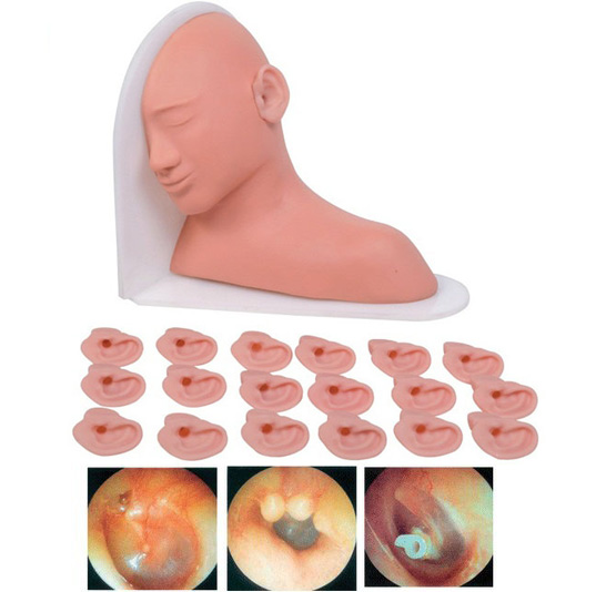 本产品是一款用于训练耳内检查及治疗操作的多功能模型。模型精确地模拟了外耳及中耳的结构,可通过简单的拆卸安装模拟不同病症的耳。模型仿照真人大小制作,通过更换含有彩色病变的耳附件,给训练者提供了多种检查训练、考核的真实场景。