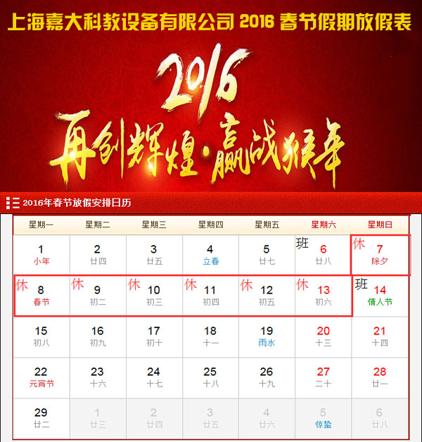 上海嘉大科教设备公司2016春节假期放假安排