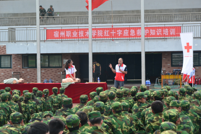 在宿州市红十字精神传播大队的志愿者们来到宿州职业技术学院,为正值军训期间的大一新生们开展了一堂急救培训课。