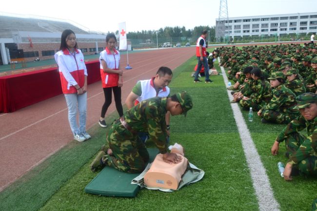 一千多名身着绿色迷彩服的新生们在操场上席地而坐,认真聆听志愿者老师讲述人员遭遇紧急情况时心肺复苏的步骤和要领、气道梗阻“”海氏冲击法“”以及外伤流血和身体部位骨折时的包扎技巧,并做了相关的现场整套示范。