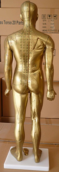这款青铜色的模型非常详细地标明了14条主要经络线,身体右侧是361个经穴和48个经外穴以及骨度线,即用“寸”来方便地测量针灸点之间的距离。身体左侧是皮下组织,显示神经系统分布、动静脉、血管和肌肉构造,还标明了在主要经络线上没有标明的手足部的经外穴。适用于中医教学、针灸和推拿等。用玻璃钢制成。尺寸:178CM高。