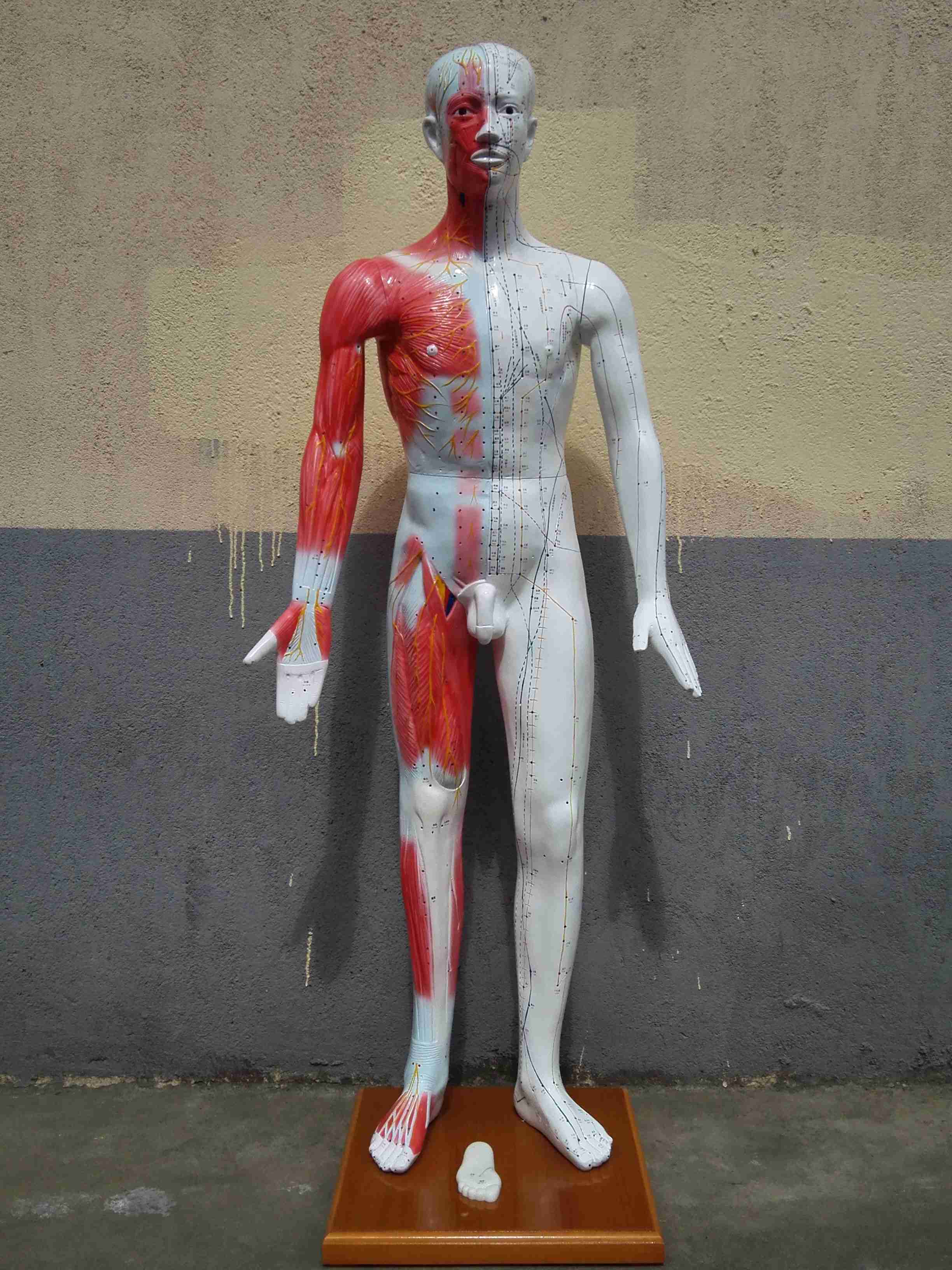 14条主要经络线,身体右侧是361个经穴和48个经外穴以及骨度线,身体左侧是皮下组织,显示神经系统分布、动静脉、血管和肌肉构造,标明手足部的经外穴;净高168cm,底座5cm左右,净重20KG,毛重22KG,外箱125*45*57,玻璃钢材质